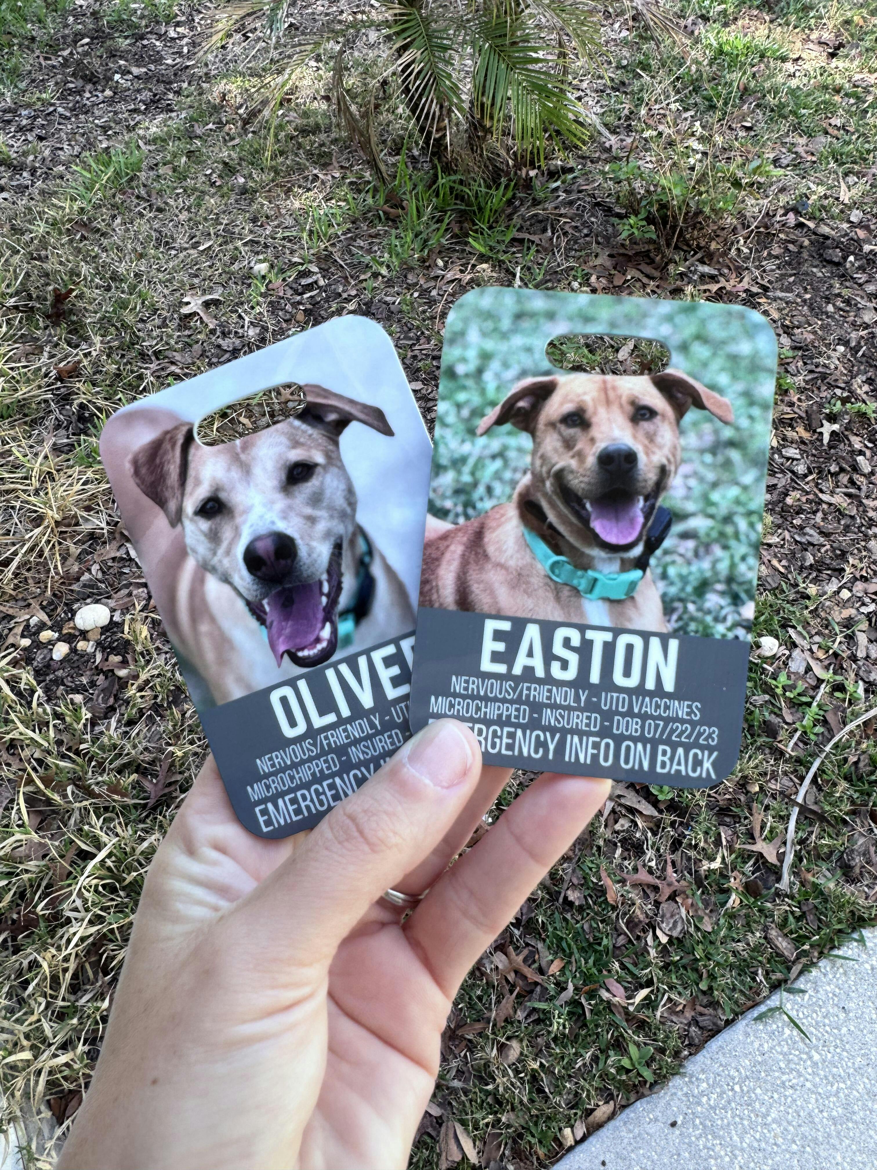 Your kennel setup has just been upgraded... Our emergency tags can hold all of your pet's most valuable information while being convenient enough for first responders to access in the case of an accident. Put as little, or as much information as you would like, add your pet's best photo, and choose the perfect color scheme to match your setup.